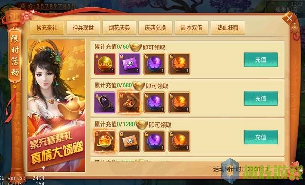 活动说明:累充送豪礼,真情大回馈,活动期间累计充值达到指定元宝,即可领取多倍经验卡、翅膀潜能丹,极品时装幻化等丰厚大礼!