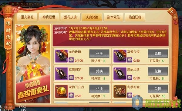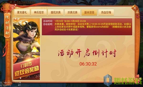 欢度小年活动限时开放,1月25日-1月28日开启欢度小年活动,活动期间每日登陆均有好礼相送,累计充值更有额外大礼,副本双倍掉落限时开启,快速冲级就是这么简单,更有全民鉴宝等你引鉴~(新服首周设有丰富的开服活动,暂不开启该活动)