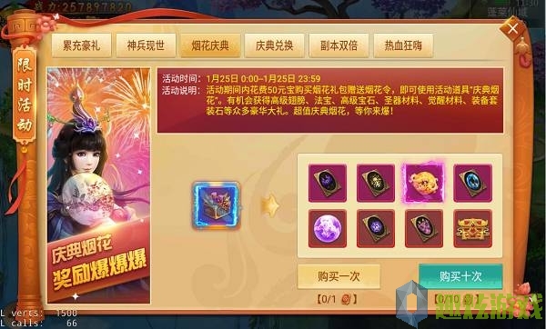 活动说明:活动期间内花费50元宝购买并使用活动道具“庆典烟花”,即有机会获得高级翅膀、法宝、高级宝石、装备套装石等众多豪华大礼。超值庆典烟花,等你来爆!