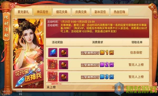 活动说明:天尊神装,重现江湖!活动时间内消费排行第一名的玩家可获得绝世天尊装备/材料,第二名可获得极品饰品,三四五名可获得极品红装!(活动结束后通过邮件发放)