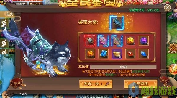 活动说明:活动期间,可以花费50元宝进行鉴宝,鉴宝一次增加一点幸运值,幸运值越高中奖几率越高,幸运值满必开大奖。大奖:珍贵坐骑-灵巧蓝猫